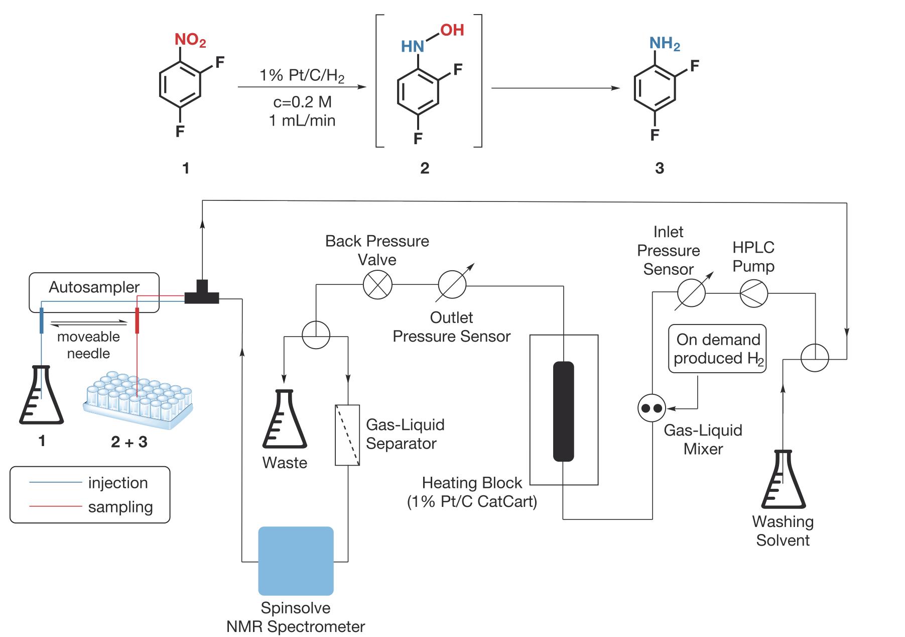 Brooks Autosampler ve Magritek Spinsolve NMR spektrometresini H-Cube® Pro sürekli akış reaktörümüzle birleştirerek, nitro grup hidrojene edilmesi reaksiyonunun hızlı parametre taraması ve gerçek zamanlı izlenmesi için otomatikleştirilmiş bir prosedürü gösterdik. İlk denemede, 6 enjeksiyon, reaksiyon, analiz ve örnekleme döngüsünü içeren koşullar arasında optimum koşullar bulunmuş ve bu süreç, 10 dakikalık gerçek insan müdahalesi süresiyle tek bir çalışma gününe kolayca sığdırılmıştır.