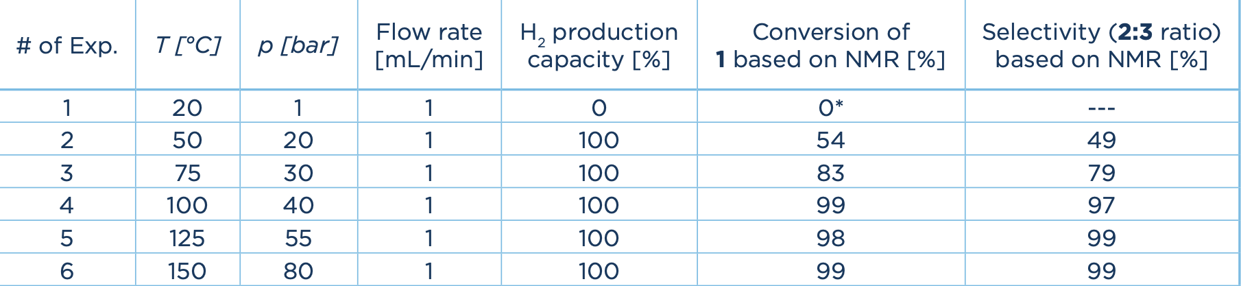 1’in tam dönüşümü ilk olarak deney 4’te (100°C, 40 bar) gözlemlenmiştir, ancak ara ürün N-hidroksilamin 2 hala çözeltide mevcuttur. Reaksiyonun sıcaklık ve basıncını daha da artırarak, tam seçiciliğe ulaşılabilir ve istenilen anilin türevi 3’ün kantitatif verimi deney 5’te (125°C, 55 bar) elde edilmiştir. 1’in dönüşümü, ara ürün 2 ve ürün 3’ün varlığı Şekil 3’te gösterilmektedir.