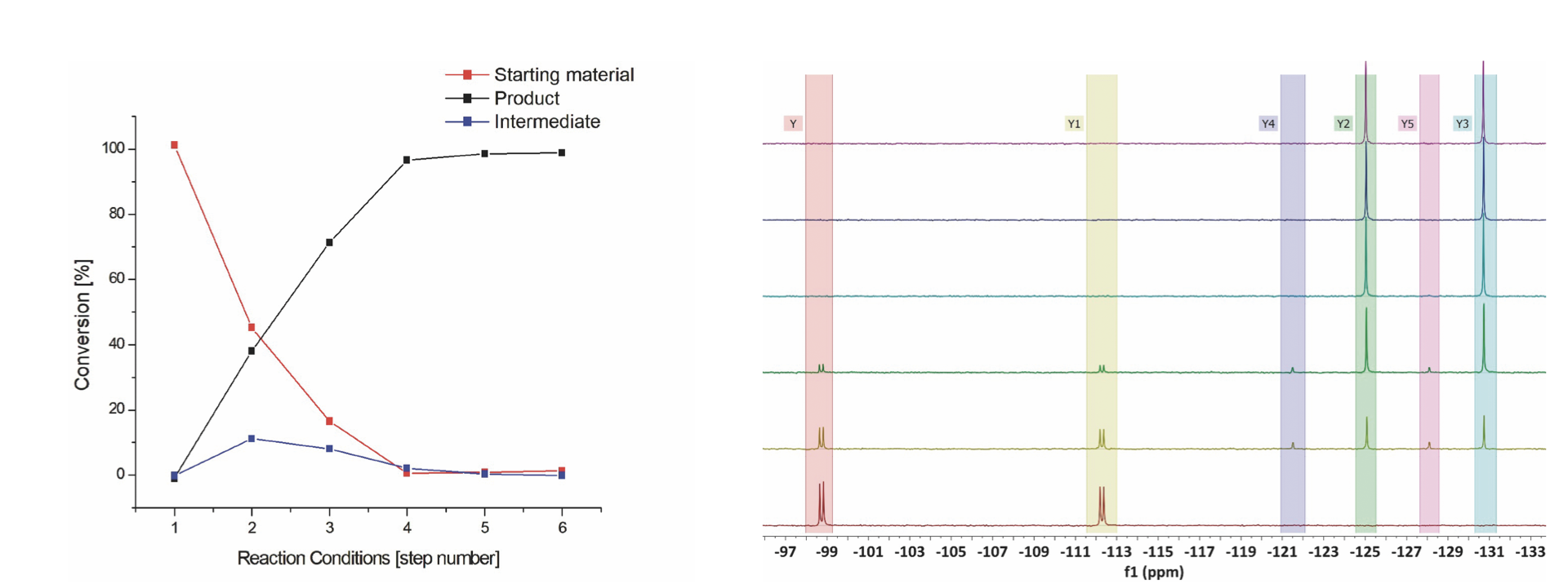 Spektrometre şu parametrelerle ayarlanmıştır: Spinsolve yazılımı, izleme döngülerinin kolayca kurulabileceği reaksiyon izleme modülü RMX’i içerir. Bu deneyler için yazılımın sürekli akış modunu kullanarak akış reaktörünün çıktısını düzenli zaman aralıklarında izledik. RMX döngüsü, 19F spektrumu almak için 1H dekuplajı ile birlikte Fluorine HDEC WALTZ dizisi kullanılarak ayarlanmıştır.