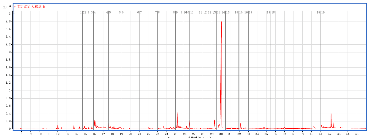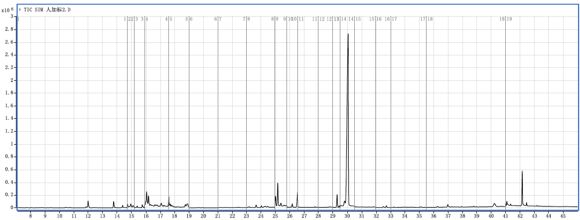 Şekil 2 Matris katkılı çözeltinin GC-MS toplam iyon akış kromatogramı