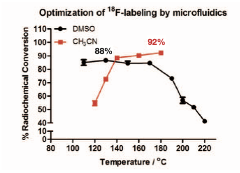 PET’te kullanılan farklı radyotransferlerin yapı taşları olan flor-18 işaretli floroanilinler model reaksiyon için seçilmiştir. İlk olarak, 1,4-dinitrobenzenin [18F]Et4NF ile florlanması optimize edilmiş ve 80 µL/dak akış hızı ve çözücü olarak CH3CN kullanılarak 180 °C’de %92 radyokimyasal dönüşümle 18F-işaretli bileşik elde edilmiştir. Reaksiyon 5 dakika içinde gerçekleştirilmiştir.