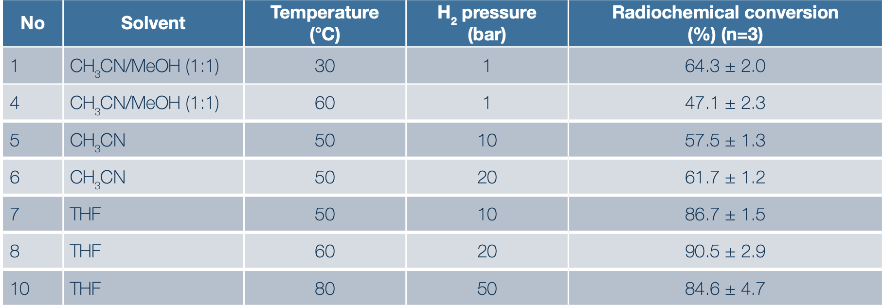 Nitro grubu hidrojenasyonunun optimizasyonu sırasında tüm parametreler – çözücü, akış hızı, reaksiyon sıcaklığı ve basınç – taranmıştır (Tablo 1). Çözücü olarak THF, 1 mL/dak akış hızı, 20 bar ve 60 °C reaksiyon basıncı ve sıcaklığı kullanılarak optimum koşullarda 3 dakikada %90 dönüşüm elde edilmiştir. Pd/C dolgulu kartuşlar 15 kullanımdan sonra herhangi bir bozulma gözlenmeden değiştirilmiştir. Son olarak, otomatik izolasyon, spesifik aktivite >1,2 Ci/µmol ile %32 ± 5 (n=3) bozunmaya göre düzeltilmiş radyokimyasal verimle nihai bileşikle sonuçlanmıştır. Tüm süreç 40 dakikalık bir toplam reaksiyon süresi gerektirmiştir.