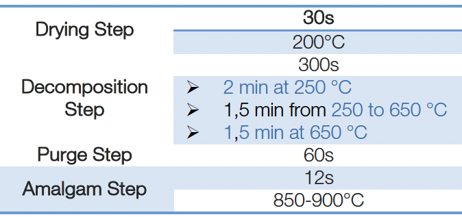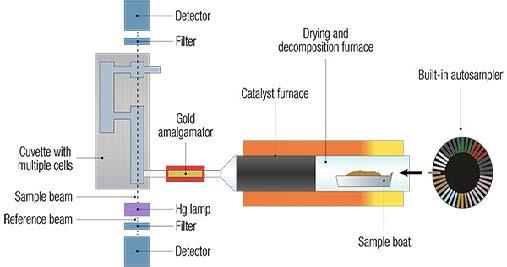 Örnekler cihazın oksijen/hava akışında 650 °C ila 900 °C arasındaki sıcaklıklarda termal olarak ayrıştırılır. Yanma gazları ~615 °C’ye ayarlanmış bir katalizör tüpünden geçer. Bu adımın sonucu, tüm cıvanın atomik formuna (Hg0) dönüştürülmesi ve parazitlerin dışarı atılmasıdır. Cıva atomik buharları daha sonra bir altın amalgamatör üzerinde zenginleştirilir ve 800°-900°C’de termal olarak serbest bırakılır. Son olarak, atomik buharlar 253,7 nm dalga boyunda bir UV ölçüm küvet sisteminden geçer. Tüm süreç her örnek için 6 dakikadan az sürer.