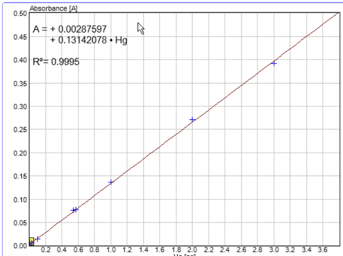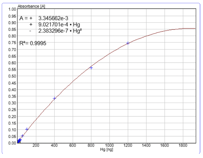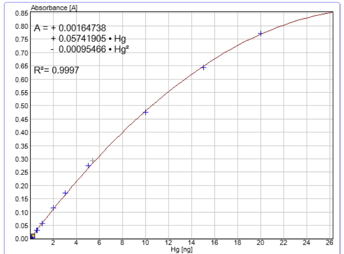 Sıvı kalibrasyon standartları, ticarî olarak temin edilebilen ve %5 HNO3 içinde muhafaza edilen 1000 mg/L Hg çözeltisi kullanılarak hazırlanabilir. 1 ila 1000 ppb arasındaki çalışma standartları hazırlanmış ve %2 HCl içinde muhafaza edilmiş, ardından amber cam şişelerde saklanmıştır. Kalibrasyon eğrileri, artan hacimlerde standartların (1ppb’den 1000ppb’ye kadar) doğrudan kuvars numune teknelerine enjekte edilmesiyle oluşturulmuş ve böylece 0-500 ng cıva aralığını kapsamıştır. Teknik matriksten bağımsız olduğu için kalibrasyon standartları sıvı ya da katı olabilir.