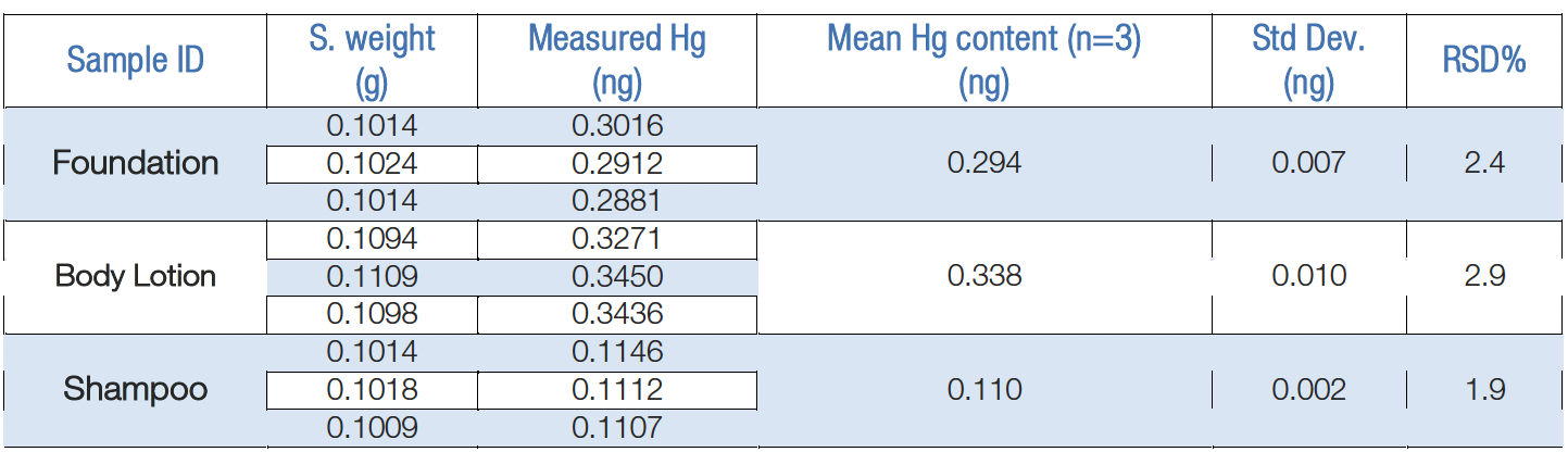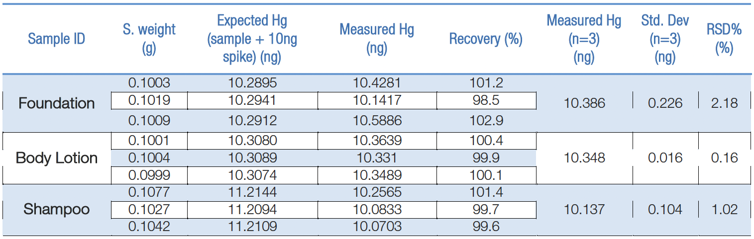 Fondöten, Vücut Losyonu ve Şampuan numuneleri, ISO 23674 yöntemi kullanılarak ve geri kazanım kontrol spike’ı olarak 0,1 mL 100ppb (10ng Hg) standart eklenerek dahili laboratuvarımızda analize tabi tutulmuştur. İlk olarak, bu numuneler ticari ürünlerdeki cıva içeriğini ölçmek için analiz edilmiştir.