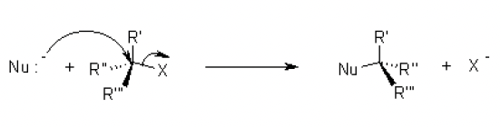 Nükleofilik sübstitüsyon, bir elektron çifti vericisinin (nükleofil, Nu) bir elektron çifti alıcısı (elektrofil) ile reaksiyonudur. Nükleofilik sübstitüsyon mekanizmasında SN2 terimi, gerçek geçiş durumuna iki molekülün dahil olduğu anlamına gelir.