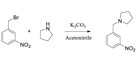 1-(3-nitrobenzil)pirolidin sentezi için, 3-nitrobenzilbromürün elektrofil ve tetrahidropirolün nükleofil olduğu SN2 mekanizması kullanılmıştır, Nu. SN2 reaksiyonlarında, reaksiyon hızını etkileyen birkaç koşul vardır ve çok kararlı bir sıcaklık gereklidir. Bununla birlikte, hidrojen bağı özelliğinin olmaması nedeniyle aprotik bir çözücü de kullanılır. Sentez reaksiyonundan elde edilen ürünün karakterizasyonu için, reaksiyon performansını doğrulamak amacıyla 3 farklı analitik cihaz kullanılmıştır: kütle spektrometresi (EI), NMR Spektroskopisi ve Fourier-transform infraredspektroskopisi ile bağlantılı bir Gaz Kromatografi sistemi.
