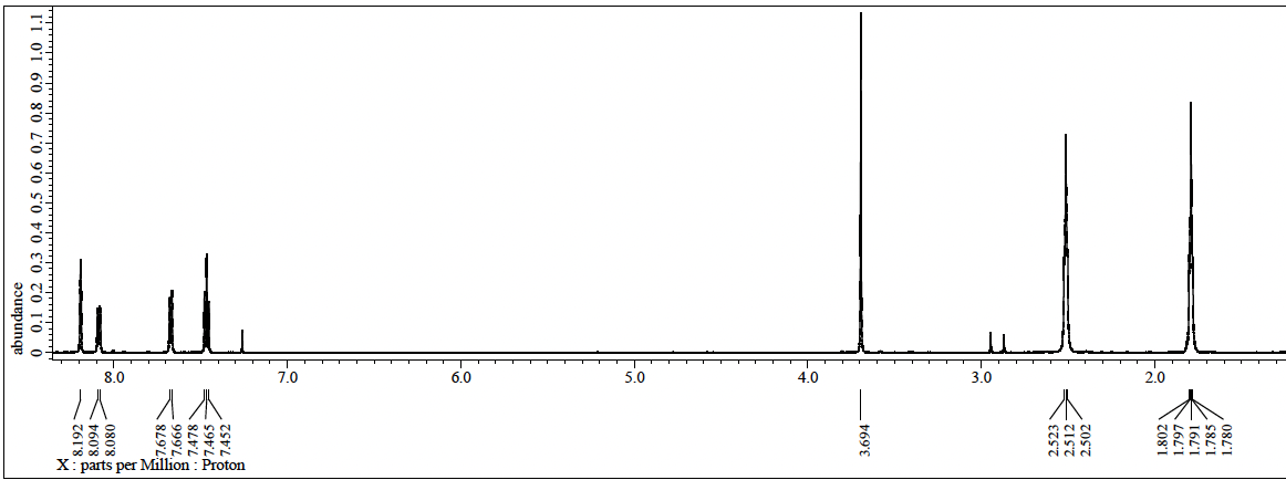 1 H NMR (600 MHz, CDCl3) δ 8.18 (s, 1H), 8.08 (d, J = 8.2, 2.4, 1.1 Hz, 1H), 7.66 (d, J = 7.6, 1.4 Hz, 1H), 7.45 (t, J = 7.9Hz, 1H), 3.68 (s, 2H), 2.53 – 2.47 (m, 5H), 1.81 – 1.76 (m, 4H).