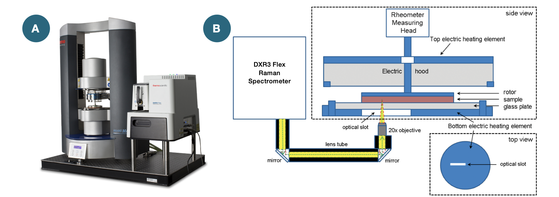Şekil 1. (a) Thermo Scientific HAAKE™ MARS RheoRaman Sistemi için RheoRaman modülü. (b) MARS RheoRaman Sisteminin şematik diyagramı (reometre numune aşamasının yan ve üst görünümlerini göstermektedir). DXR3 Flex Raman Spektrometresi, ışığı 20x objektife yönlendiren lens tüpleri ve aynalar kullanılarak MARS reometresine serbest alanla bağlanır. Objektif, gelen lazeri (yeşil kesikli çizgi) odaklar ve reometre aşamasının üstünde oturan numuneden çıkan geri saçılmış Raman ışığını (sarı) toplar.