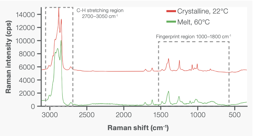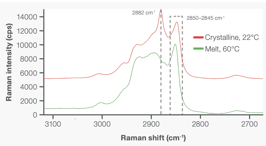 Bu şekilde, 2850 cm-1 ve 2882 cm-1 bantları sırasıyla amorf ve kristalin içeriğin güçlü göstergeleridir.3 Daha sonra, I2882/I2850 pik yoğunluk oranı, in situ RheoRaman ölçümleri sırasında kristal oluşumunu dinamik olarak izlemek için kullanıldı.