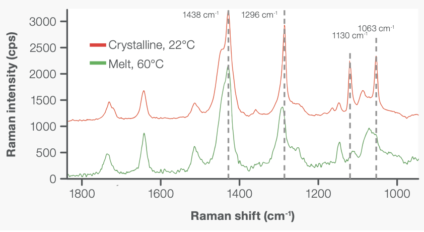 Katılaşma süreci sırasında 1130 cm-1 ve 1063 cm-1’de iki belirgin özellik ortaya çıktı; bunlar sırasıyla simetrik ve asimetrik C-C gerilmelerinden kaynaklanıyordu.4,5 Erimiş fazda, tüm C-C gerilme bantları, metil gauchekonformasyonlarının düzensizlik etkileri nedeniyle nispeten zayıf ve genişti.