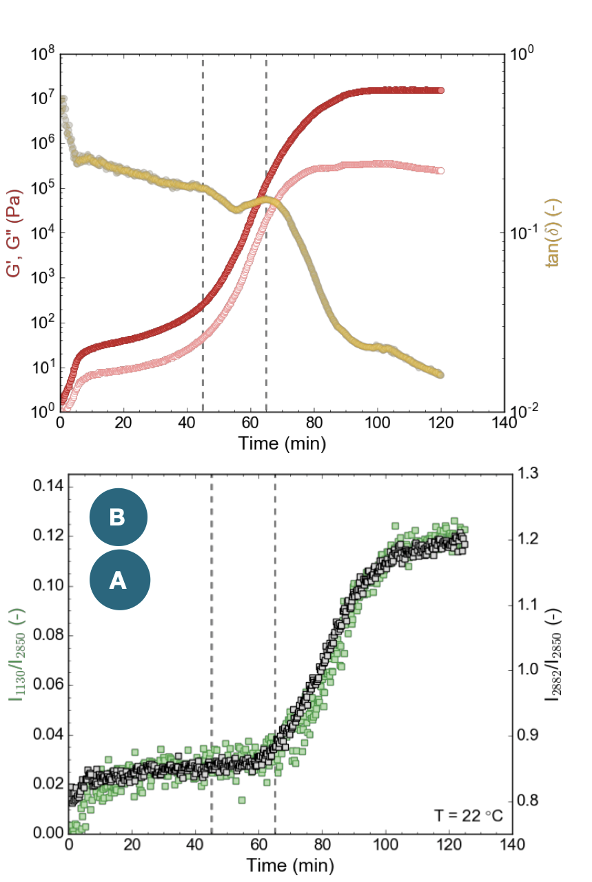 Genel olarak, 1130 ve 2882 cm-1 spektral oranlarındaki artış hızı, hem G’ hem de G” için gözlemlenen değişim hızıyla benzerdi (yani, benzer eğimlerle arttılar). Ancak, G’ ve G”’de gözlemlenen artış ile Raman yoğunluk oranlarındaki artış arasında fark edilebilir bir 15-20 dakikalık bir gecikme vardı. G’ ve G”’deki keskin artış, deformasyona karşı artan bir direnç gösteriyor (yani, CB’nin hacimsel sertleşmesi), bu da katılaşma sürecinin başladığını belirtiyor. Öte yandan, Raman spektral işaretçileri, kristal oluşumunu gösteriyor. Bu nedenle, reoloji ve Raman profilleri arasındaki zaman gecikmesi, CB’nin ilk olarak amorf bir katı hale geldiğini, ardından amorf bir katıdan kristalin bir katıya dönüşümünü gösteriyor. Bu morfolojik dönüşüm, kristal CB yapılarıyla ilişkili Raman bantlarının (1130 ve 2882 cm-1 pikleri) sonraki artışıyla belirtildi. Reolojik ve Raman spektral profillerinin zamansal ayrılması, CB’nin hacimsel sertleşmesi ile kristalin bölgelerin oluşumu arasında açık bir ayrım olduğunu gösteriyor.