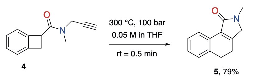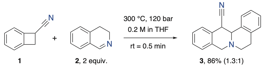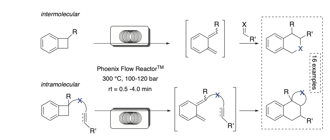 Farklı imin dienofillerinin 1-benzosiklobütan-karbonitril (1) ile intermoleküler Diels-Alder sikloekleksiyonları, Phoenix Flow Reactor™ kullanılarak 300 °C ve 120 bar koşullarında incelenmiştir. Reaksiyonlar regiospesifikti (cis/trans oranları, ham reaksiyon karışımının 1H NMR spektroskopik analiziyle belirlenmiştir) ve tüm durumlarda yalnızca 30 saniyede tam dönüşüm elde edilebilmiştir. (Karşılaştırmak gerekirse, batch ve mikrodalga işlemleri sırasıyla 6 saatte (%7 dönüşüm) ve 1 saatte (tam dönüşüm) 180 °C’de gerçekleştirilmiştir). Test edilen intramoleküler reaksiyonlarda, olefinler ve alkinler yalnızca cis ürünlerini yüksek verimle (ürün 5 için %79) vermiştir. Siloksi bileşenleriyle yapılan reaksiyonlar da test edilerek alkil silyl eter ve vinil silyl eter elde edilmiştir. Aldehitler ve nitriller de Diels-Alder reaksiyonuna katılarak orta derecede verimle sonuçlanmıştır. 1,2-disübstitüe alkenlerde, ürünün her iki diastereomerinin oluşumu gözlemlenmiştir. Benzoizoindolin benzeri ürünlerin sentezinde, başlangıç bileşiklerinin dimerizasyonunu engellemek için daha seyrek (0.05 M) koşullar gerekmektedir. Dihidrobenzo(tiyofen)-2,2-dioksitler ve benzoizotiyazolin-2,2-dioksitler, SO2’nin termal cheletropik ekstrüzyonu ile orto-kinodimetanların öncülleri olarak kullanılabilir. Ayrıca, olefinler ve alkinlerle yapılan intramoleküler Diels-Alder reaksiyonlarında test edilmiştir: Beklenen ürünler iyi verimle elde edilmiştir, ancak reaksiyonlar daha uzun ikamet süreleri (4 dakika) gerektirmiştir.
