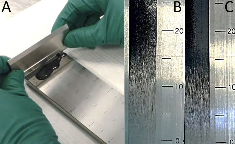 Şekil 3. (A) Öğütücüde katot bulamacının incelenmesi. Katot bulamacının ortalama parçacık boyutu, (B) yüksek verimde üretildiğinde (C) düşük verimde üretildiğinden daha büyüktür.