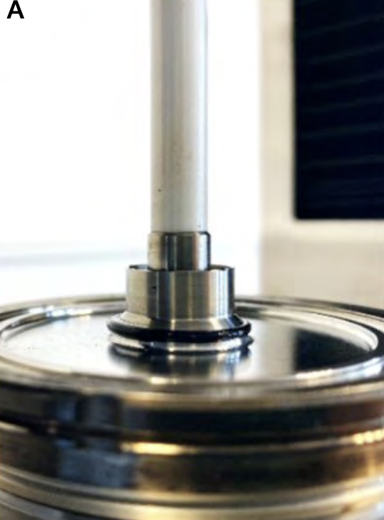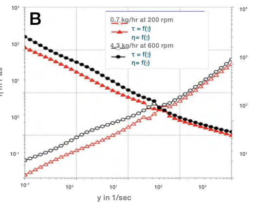 Şekil 4. (A) Plaka-plaka geometrisi ile HAAKE MARS Reometrede katot çamurunun reolojik karakterizasyonu. (B) Düşük ve yüksek verim ve vida hızında üretilen katot çamurlarının gerinim hızına bağlı viskozite fonksiyonu.