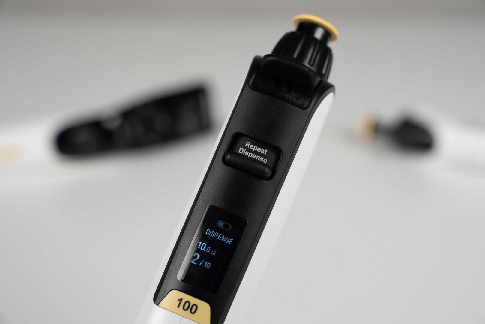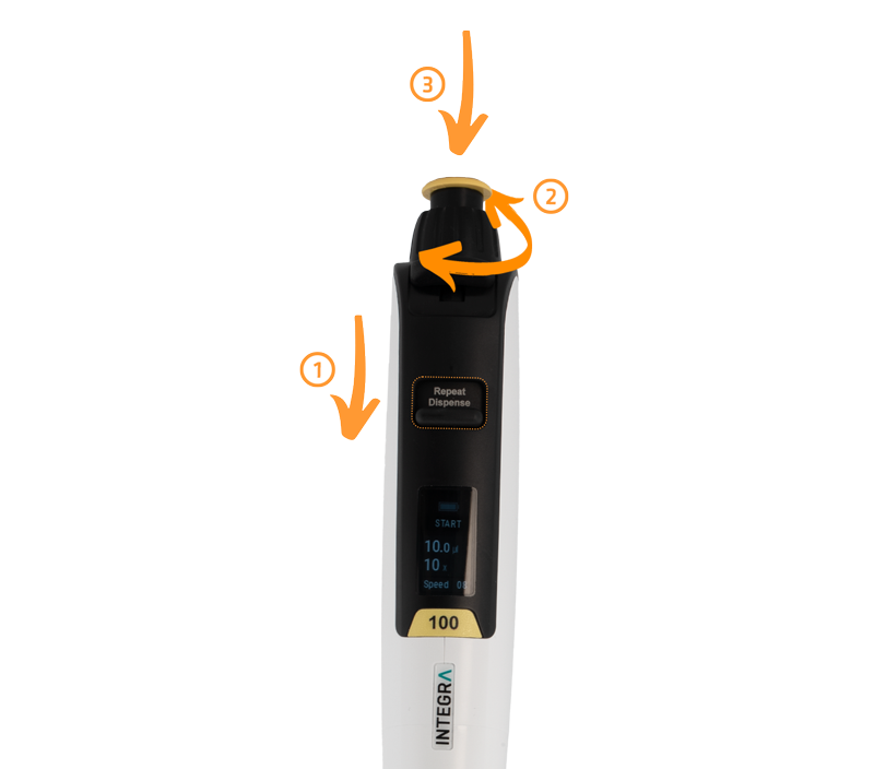 SWITCH, elektronik pipetlerin en sık kullanılan özelliği olan tekrarlı dağıtımı, karmaşık programlama gerektirmeden kolaylaştırmak için de kullanılabilir. Mod anahtarını (1) kullanarak manuel pipetlemeden elektronik pipetlemeye sorunsuz şekilde geçiş yapın ve hızlı ayar halkasıyla (2) dağıtım hacmini, alikot sayısını ve pipetleme hızını tanımlayın. Bu parametreler ayarlandıktan sonra, aspire etme ve her bir dağıtım işlemi pipet tarafından hassas şekilde kontrol edilir ve pistona (3) basılarak kolayca gerçekleştirilir.